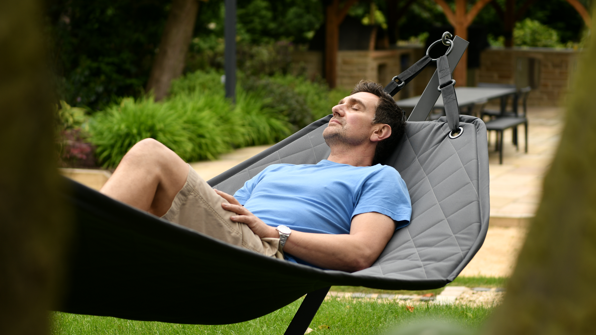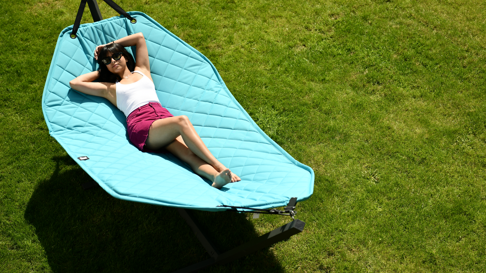 Who doesn’t love the thought of drifting asleep on an ever-so-gently swaying hammock? We certainly do. That’s why we applied our legendary bean bag know-how to creating this sumptuous relaxation piece. It’s crafted from our super-soft yet durable quilted fabric. And supported by an ultra-stable base in lightweight tubular steel that’s easily erected and neatly folded away in no time.